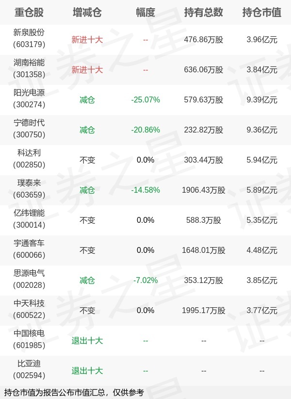 本站消息,10月28日华夏基金旗下杨宇管理的华夏能源革新股票型基金公布三季报鑫月配,近1年净值增长率30.35%。与上一季度相比,该基金前十大重仓股新增新泉股份,湖南裕能;其中阳光电源持仓占比9.37%,为该基金第一大重仓股;中国核电,比亚迪等退出前十大重仓股;详细数据如下: